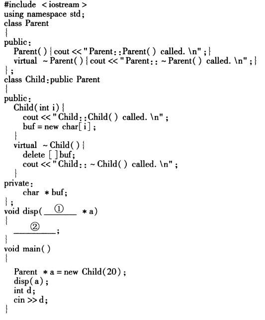 当使用new运算符生成对象指针时,自动调用本类的构造函数。使用delete删除这个对象时,首先为这个动态对象调用本类的析构函数,然后再释放这个动态对象占用的内存。这和使用new建立动态对象的过程正好相反。故第2空:delete a