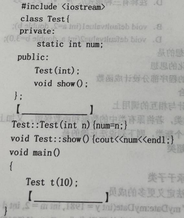 补全代码使得num初始化值为5,程序产生对象t且修改num值为10,使用show()函数输出num的值。