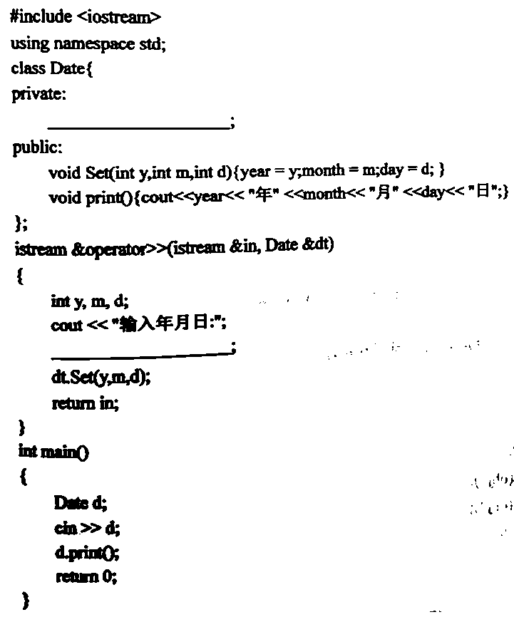 (2)接受从键盘输入的y、m、d信息,所以此空为:in>>y>>m>>d;(注意上面的形参是in)。