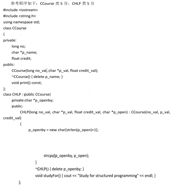 定义一个课程类CCourse,其中包含课程号(long no)、课程名(char*p_name)、分数(float credit 作者:高老师 时间:2024-07-27 浏览 1 定义一个课程类CCourse,其中包含课程号(long no)、课程名(char*p_name)、分数(float credit)三个数据成员,以及相应的构造函数、析构函数、打印数据成员的成员函数。以CCourse类为基类,派生出帮助类CHLP,并在这个类中分别增加一个指针数据成员(char *p_openby)和表示用途的成员函数(void studyFor()——可输出一条表示CHLP类用途的信息)。写出CHLP类的完整定义(包括构造、析构和studyFor()成员函数的实现)。【正确答案】: 📱 扫码体验刷题小程序 扫一扫使用我们的微信小程序