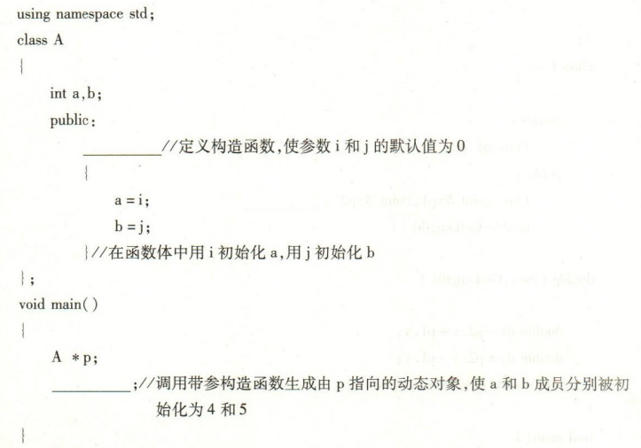 请根据要求将程序补充完整。 作者:高老师 时间:2024-07-27 浏览 0 请根据要求将程序补充完整。【正确答案】:A(int i=0,int j=0)p=new A(4,5) 📱 扫码体验刷题小程序 扫一扫使用我们的微信小程序