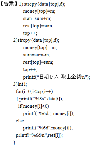 设计一个Bank类,实现银行某账号的资金往来账目管理,包括建账号、存入、取出等。解:Bank类包括私有数据成员top(当前账指针),date(日期),money(金额),rest(余额)和sum(累计余额)。有三个成员函数bankin()(处理存入账),bankout()处理取出账)和disp()(输出明细账)请完成函数的实现。