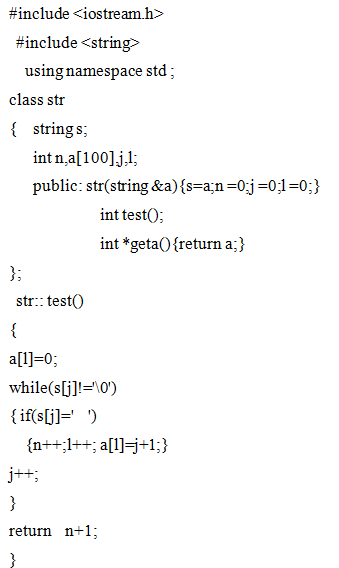 在字符串类string中实现一个判断函数,该函数功能是统计某一字符串类对象(仅有单词和空格组成)有多少个单词,同时保存所有单词在字符串中的起始地址(设该字符串不超过100个单词)