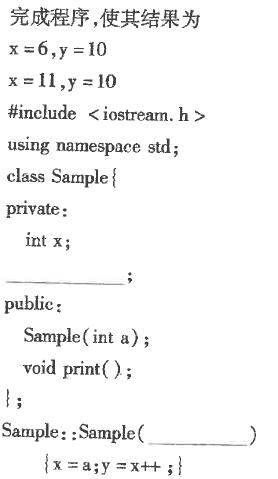 作者:高老师 时间:2024-07-27 浏览 0 【正确答案】:第一空:static int y 第二空:int a【题目解析】: int Sample::y=25;是初始化静态成员y,所以第一空定义成员y应该是static int y; 由于第二空定义类Sample成员函数Sample( ),所以括号里应该填参数int a。 📱 扫码体验刷题小程序 扫一扫使用我们的微信小程序