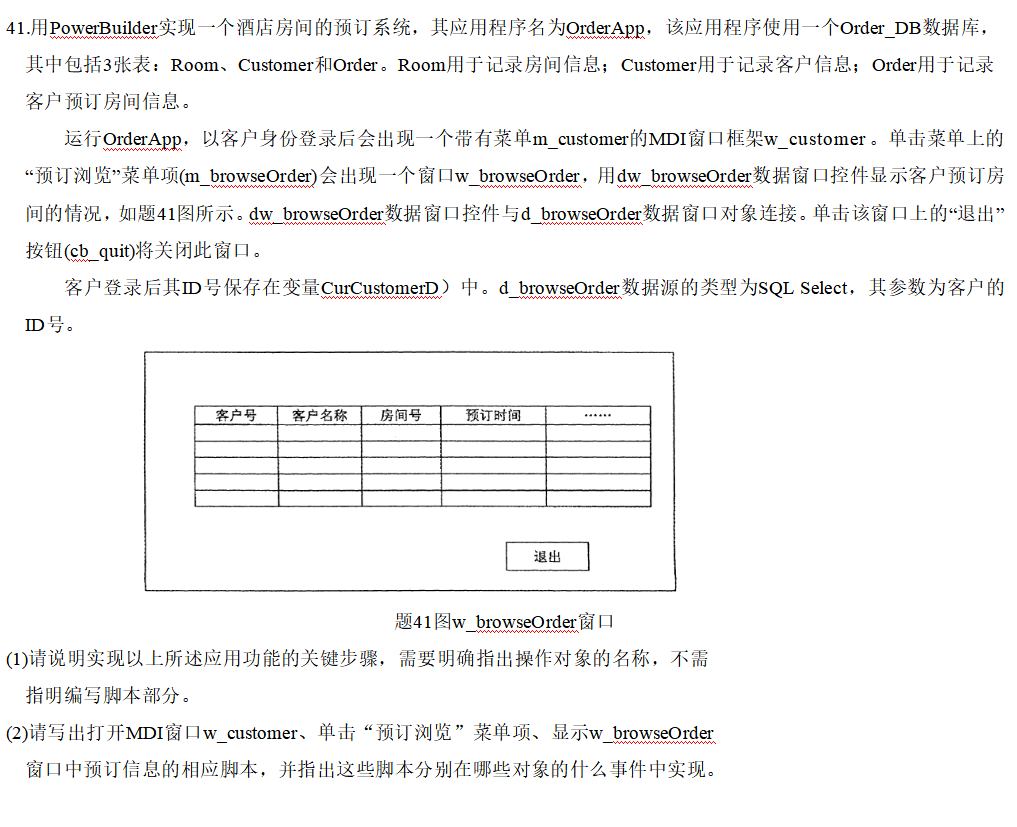 【正确答案】:(1)(a)在数据库画板中创建数据库Order_DB,并在其中新建3张表Room、 Customer和 Order;(b)创建应用程序对象OrderApp;(c)在菜单画板中创建菜单customer;(d)在数据窗口画板中创建d_browse Order数据窗口对象;(e)在窗口画板中创建MDI窗口w_customer,将窗口类型设置为 MDI MicroHelp并在 Windows属性对话框中将 Menu Name设置为m_customer,在窗口中添加数据窗口控件dw_browseOrder,并将其 Data Window Object Named属性设置为browseOrder;添加一个命令按钮,并将其显示文本改为“退出”。(2)(a)在应用程序对象OrderApp的open事件中打开MDI窗口w_customer,本为 Open(w_customer)。(b)在m_browseOrder的 Clicked事件中打开w_browseOrder窗口浏览预订信息,其脚本为Open(w_browseOrder)(c)在w_browse Order窗口的Open事件中输入脚本: dw_browseOrder. settransobject( sqlea) dw_browseOrder. retrieve( CurCustomerID)