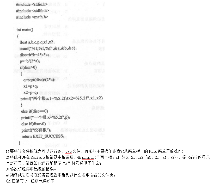 以下两题中的程序代码分别是用C帮C++语言编写的“求一元二次方程根”的C和C++程序代码,任选其中一题作答,两题都做仅算第一题的 作者:高老师 时间:2024-07-27 浏览 2 以下两题中的程序代码分别是用C帮C++语言编写的“求一元二次方程根”的C和C++程序代码,任选其中一题作答,两题都做仅算第一题的分数。(1) 已编写C程序代码如下:【正确答案】: 📱 扫码体验刷题小程序 扫一扫使用我们的微信小程序