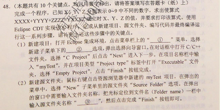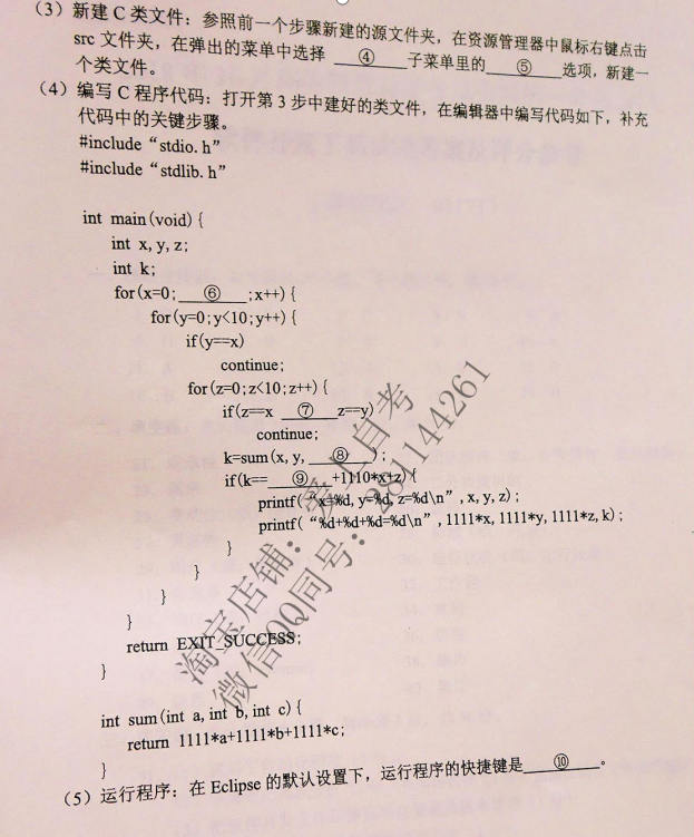作者:高老师 时间:2024-07-27 浏览 2 【正确答案】:①文件(或者:File);②项目(或者: Project);③src④新建(或者:New);⑤Class(或者:类);⑥x<10(或者:x<=9);⑦||⑧z;⑨10000*y(或者:y*10000);⑩Ctrl+F11 📱 扫码体验刷题小程序 扫一扫使用我们的微信小程序