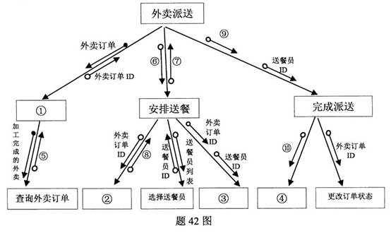 餐饮外卖系统中的外卖派送部分的模块结构图如题42图所示。其中未填充的4个模块名如下:A.获得外卖订单B.查询送餐员C.取餐派送D 作者:高老师 时间:2024-07-28 浏览 8 餐饮外卖系统中的外卖派送部分的模块结构图如题42图所示。其中未填充的4个模块名如下:A.获得外卖订单B.查询送餐员C.取餐派送D.通知客人模块之间未标明的3个数据流如下:E.外卖订单IDF.送餐员IDG.送餐员列表请写出题42图中的数字①②③④⑤⑥⑦⑧⑨⑩所对应的模块名或数据流名前的大写字母。请写出题42图中的数字①②③④⑤⑥⑦⑧⑨⑩所对应的模块名或数据流名前的大写字母。【正确答案】:①:A ②:B ③:C ④:D ⑤:E ⑥:E ⑦:F ⑧:G ⑨:E ⑩:E 📱 扫码体验刷题小程序 扫一扫使用我们的微信小程序