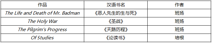 Which of the following is not included in Bunyan's works?() 作者:高老师 时间:2024-07-28 浏览 0 Which of the following is not included in Bunyan's works?()A、The Life and Death of Mr. BadmanB、The Holy WarC、The Pilgrim's ProgressD、Of Studies【正确答案】:D【题目解析】:本题考查班扬的主要作品。四个选项的作品及作者如下表所示:故选D。 📱 扫码体验刷题小程序 扫一扫使用我们的微信小程序