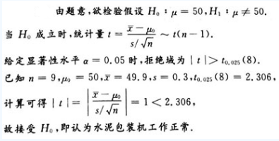 某水泥厂用自动包装机包装水泥,每袋水泥重量服从正态分布,当包装机正常工作时,每袋水泥的平均重量为50kg,某日开工后随机抽取9袋,测得样本均值为49.9kg,样本标准差为s=0.3kg,问当日水泥包装机工作是否正常?(显著性水平α=0.05)![]()