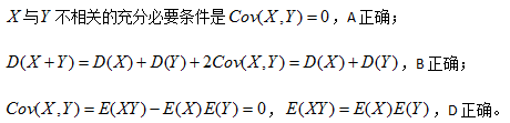 X与Y不相关,则下列等式中不成立的是() 作者:高老师 时间:2024-07-28 浏览 0 X与Y不相关,则下列等式中不成立的是()A、Cov(X,Y)=0B、D(X+Y)=D(X)+D(Y)C、D(XY)=D(X)D(Y)D、E(XY)=E(X)E(Y)【正确答案】:C【题目解析】:答案为C 📱 扫码体验刷题小程序 扫一扫使用我们的微信小程序