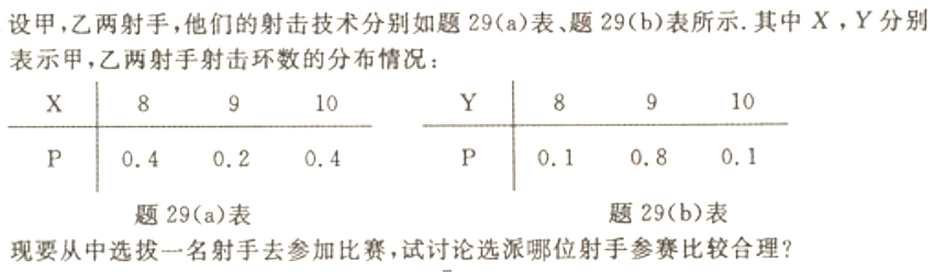 作者:高老师 时间:2024-07-28 浏览 0 【正确答案】:【题目解析】:参赛选手比较:(1)看射击环数期望:通常选择平均水品较高者,即射击环数期望较大者;(2)当射击环数期望相近时,看方差:通常选发挥较稳定者,即射击环数方差较小者。故本题,分别计算期望和方差,可知,E(X)=E(Y),D(X)>D(Y),故选择乙。 📱 扫码体验刷题小程序 扫一扫使用我们的微信小程序