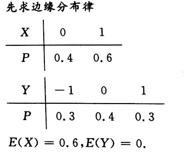 【题目解析】:(1)X的取值有0、1P{X=0}=P{X=0,Y=-1}+P{X=0,Y=0}+P{X=0,Y=1}=0.1+0.2+0.1=0.4P{X=1}=P{X=1,Y=-1}+P{X=1,Y=0}+P{X=1,Y=1}=0.2+0.2+0.2=0.6列出X的分布律如答案所示。E(X)=0×0.4+1×0.6=0.6 (2)Y的取值有-1、0、1P{Y=-1}=P{X=0,Y=-1}+P{X=1,Y=-1}=0.1+0.2=0.3P{Y=0}=P{X=0,Y=0}+P{X=1,Y=0}=0.2+0.2=0.4P{Y=1}=P{X=0,Y=1}+P{X=1,Y=1}=0.1+0.2=0.3列出Y的分布律如答案所示。E(Y)=-1×0.3+0×0.4+1×0.3=0