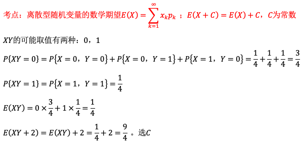 设二维随机变量(X,Y)的分布律为,则E(XY +2)=( ) 作者:高老师 时间:2024-07-28 浏览 2 设二维随机变量(X,Y)的分布律为,则E(XY +2)=( )A、1/16B、1/8C、9/4D、1/2【正确答案】:C【题目解析】: 📱 扫码体验刷题小程序 扫一扫使用我们的微信小程序
