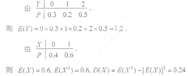 由此可知:E(Y)=1×0.2+2×0.5=1.2;E(X)=E(X²)=0.6方差:D(X)=E(X²)-[E(X)]²=0.24