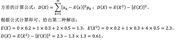 E(X)=0×0.2+1×0.3+2×0.5=1.3,D(X)=(0-1.3)²×0.2+(1-1.3)²×0.3+(2-1.3)²×0.5=0.61