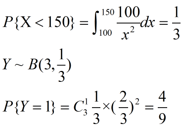 (2)根据题目,3个独立晶体管,每个晶体管在150小时内损坏的概率均为1/3,假设Y为3个晶体管在150小时内损坏的个数,则Y~B(3,1/3)