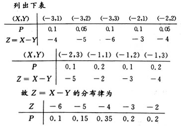 【题目解析】:Z=X-Y的可能取值有:-6,-5,-4,-3,-2P{Z=-6}=P{X=-3,Y=3}=0.1P{Z=-5}=P{X=-2,Y=3}+P{X=-3,Y=2}=0.1+0.05=0.15P{Z=-4}=P{X=-1,Y=3}+P{X=-2,Y=2}+P{X=-3,Y=1}=0.2+0.05+0.1=0.35P{Z=-3}=P{X=-2,Y=1}+P{X=-1,Y=2}=0.1+0.1=0.2P{Z=-2}=P{X=-1,Y=1}=0.2列出分布律如答案所示。