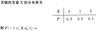 () 作者:高老师 时间:2024-07-28 浏览 1 ()A、0.2B、0.3C、0.7D、0.5【正确答案】:D【题目解析】:由于X是离散型随机变量,P{-1<X≤1}=P{X=0}+P{X=1}=0.3+0.2 📱 扫码体验刷题小程序 扫一扫使用我们的微信小程序