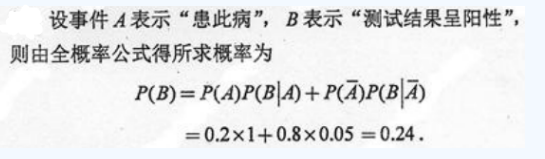 求测试结果呈阳性的概率; 作者:高老师 时间:2024-07-28 浏览 1 设某人群中患某种疾病的比例为20%,对该人群进行一种测试,若患病则测试结果一定为阳性;而未患病者中也有5%的测试结果呈阳性.求测试结果呈阳性的概率;【正确答案】:【题目解析】:不妨这样理解:假设共有100人,患病者有20人,这20人测试结果一定为阳性;未患病的有80人,其中80×5%=4人测试结果为阳性。故测试结果呈阳性的概率=(20+4)/100=0.24 📱 扫码体验刷题小程序 扫一扫使用我们的微信小程序