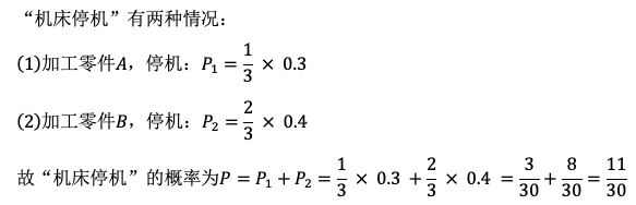 一台机器有1/3的时间加工零件A,2/3的时间加工零件B,加工零件A时停机的概率为0.3,加工零件B时停机的概率为0.4,则机床 作者:高老师 时间:2024-07-28 浏览 0 一台机器有1/3的时间加工零件A,2/3的时间加工零件B,加工零件A时停机的概率为0.3,加工零件B时停机的概率为0.4,则机床停机的概率为( )【正确答案】:11/30【题目解析】: 📱 扫码体验刷题小程序 扫一扫使用我们的微信小程序