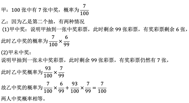 100张彩票中有7张是有奖彩票,现有甲、乙两人且甲先乙后各买一张,试计算甲、乙两人中奖的概率是否相同? 作者:高老师 时间:2024-07-28 浏览 0 100张彩票中有7张是有奖彩票,现有甲、乙两人且甲先乙后各买一张,试计算甲、乙两人中奖的概率是否相同?【正确答案】:【题目解析】: 📱 扫码体验刷题小程序 扫一扫使用我们的微信小程序