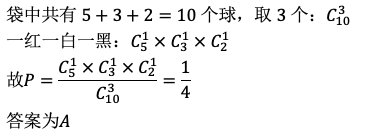 袋中有5个红球,3个白球,2个黑球,现从中任取3个球,其恰为一红一白一黑的概率为( ) 作者:高老师 时间:2024-07-28 浏览 2 袋中有5个红球,3个白球,2个黑球,现从中任取3个球,其恰为一红一白一黑的概率为( )A、B、C、D、【正确答案】:A【题目解析】: 📱 扫码体验刷题小程序 扫一扫使用我们的微信小程序