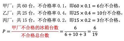 顾客开箱测试后发现冰箱不合格,试问这台冰箱来自甲厂的概率是多大? 作者:高老师 时间:2024-07-28 浏览 1 某商店有100台相同型号的冰箱待售,其中60台是甲厂生产的,25台是乙厂生产的,15台是丙厂生产的,已知这三个厂生产的冰箱质量不同,它们的不合格率依次为0.1、0.4、0.2,现有一位顾客从这批冰箱中随机地取了一台,试求:顾客开箱测试后发现冰箱不合格,试问这台冰箱来自甲厂的概率是多大?【正确答案】:不合格冰箱一共有:100-81=19;甲厂不合格冰箱有60×0.1=6;所以P=6/19【题目解析】: 📱 扫码体验刷题小程序 扫一扫使用我们的微信小程序