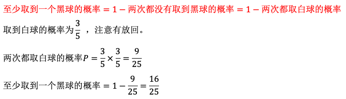 设袋中有2个黑球、3个白球,有放回地连续取2次球,每次取一个,则至少取到一个黑球的概率是_________。 作者:高老师 时间:2024-07-28 浏览 1 设袋中有2个黑球、3个白球,有放回地连续取2次球,每次取一个,则至少取到一个黑球的概率是_________。【正确答案】:【题目解析】: 📱 扫码体验刷题小程序 扫一扫使用我们的微信小程序