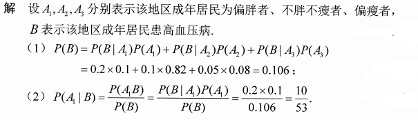 设某地区成年居民中偏胖者占10%,不胖不瘦者占82%,偏瘦者占8%,又知偏胖者患高血压病的概率为20%,不胖不瘦者患高血压病的概 作者:高老师 时间:2024-07-28 浏览 0 设某地区成年居民中偏胖者占10%,不胖不瘦者占82%,偏瘦者占8%,又知偏胖者患高血压病的概率为20%,不胖不瘦者患高血压病的概率为10%,偏瘦者患高血压病的概率为5%。(1)求该地区成年居民患高血压病的概率;(2)现知该地区某一成年居民患有高血压病,求其是偏胖者的概率。【正确答案】: 📱 扫码体验刷题小程序 扫一扫使用我们的微信小程序
