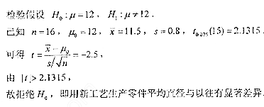 某种零件直径X~N(12,σ(上标2))(单位:mm),σ(上标2)未知,现用一种新工艺生产此种零件,随机取出16个零件,测其直 作者:高老师 时间:2024-07-28 浏览 0 某种零件直径X~N(12,σ(上标2))(单位:mm),σ(上标2)未知,现用一种新工艺生产此种零件,随机取出16个零件,测其直径,算得样本均值x=11.5,样本标准差s=0.8,问用新工艺生产的零件平均直径与以往有无显著差异?(α=0.05)(附:t(下标0.025)(15)=2.1315)【正确答案】: 📱 扫码体验刷题小程序 扫一扫使用我们的微信小程序