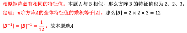 设3阶矩阵A与B相似,且已知A的特征值为2,2,3. 则() 作者:高老师 时间:2024-07-29 浏览 0 设3阶矩阵A与B相似,且已知A的特征值为2,2,3. 则()A、1/12B、1/7C、7D、12【正确答案】:A【题目解析】: 📱 扫码体验刷题小程序 扫一扫使用我们的微信小程序