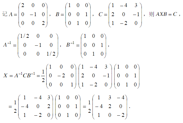 作者:高老师 时间:2024-07-29 浏览 2 【正确答案】:【题目解析】:因为A、B的逆矩阵较容易求出,可以先求出逆矩阵然后直接用矩阵乘法求解矩阵方程: 📱 扫码体验刷题小程序 扫一扫使用我们的微信小程序