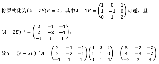 设矩阵A和B满足关系式AB=A+2B,其中,求矩阵B。 作者:高老师 时间:2024-07-29 浏览 0 设矩阵A和B满足关系式AB=A+2B,其中,求矩阵B。【正确答案】:【题目解析】:AB=A+2B⇒AB-2B=A⇒(A-2E)B=A,两边同时左乘可得。其中,,|A-2E|=-1,。矩阵的乘法运算: 📱 扫码体验刷题小程序 扫一扫使用我们的微信小程序