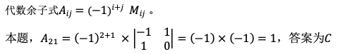 3阶行列式中元素的代数余子式=( )。 作者:高老师 时间:2024-07-29 浏览 0 3阶行列式中元素的代数余子式=( )。A、-2B、-1C、1D、2【正确答案】:C【题目解析】: 📱 扫码体验刷题小程序 扫一扫使用我们的微信小程序