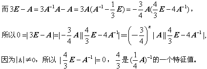 【答案解析】本题考察矩阵特征值及矩阵的有关运算。因为λ=3是可逆矩阵A的一个特征值,不妨设A为n阶矩阵,则|3E-A|=0,又