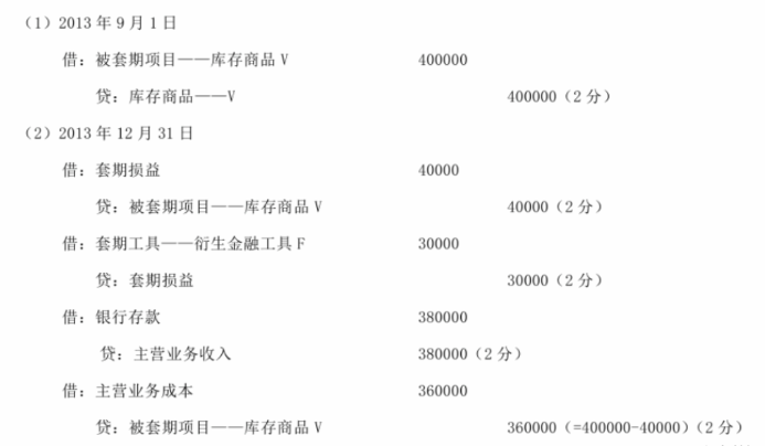 (2)2013年12月31日,存货V的公允价值下降了40000元,行生金融工具F的公允价值上涨了30000元;