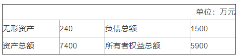 有形净值债务比率=负债总额/有形净值总 额X 100% =负债总额/(所有者权益总额一 无形资产)X100% = 1 500/(5900 -240)X 100% = 26. 50%