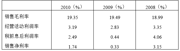注:经营活动利润率=经营活动利润/销售收入;税前息后利润率=税前息后利润/销售收入。 另外,年报数据表明该公司2009年度销售收入下降;管理当局讨论书披露管理费用5.4亿,和前一年基本保持一致,但管理费用占销售收入的比重由2008年的3.6%上升到2009年的 3.9%。 要求: (1)分析2008年至2010年销售毛利率和经营活动利润率的变化趋势; (2)分析2009年经营活动利润率下降的原因; (3)分析2009年度税前息后利润率下降速度大于经营活动利润率的原因; (4)说明2008年至2010年销售净利率和税前息后利润率的变化趋势。