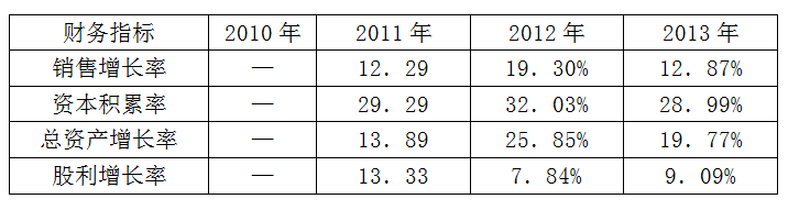 (2)销售收入、总资产、所有者权益以及股利都保持了增长,但是相比较来看,股利增长率较低,尤其在2012年,销售增长高达19.30%,总资产增长率高达25.83%,资本积累率高达32.03%的情况下,而股利增长率仅为7.8%,股利增长率与企业价值有密切关系。因此,企业应当保证股利与其他指标的同步稳定增长。