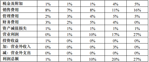3)近5年中,该公司营业利润占营业收入的比重逐年大幅下降,并出现负值,需要结合营业成本上升进行详细分析;
