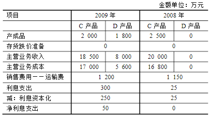 (6)除了于2008年12月借入的2年期、年利率6%的银行借款5 000万元外,W公司没有其他借款。上述长期借款专门用于扩建现有的一条生产线,以满足D产品的生产需要。该生产线总投资6 500万元,2008年12月开工,2009年7月完工投入使用。(假设不考虑利息收入)