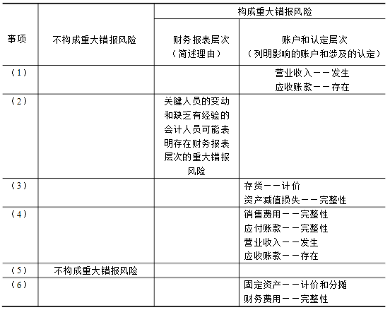 要求:针对资料二(1)至(6)项,结合资料一,假定不考虑其他条件,请逐项指出资料二所列事项是否可能表明W公司存在重大错报风险。如果认为存在,并分别说明该风险是属于财务报表层次还是认定层次。如果是属于财务报表层次,简述理由。如果认为属于认定层次,请指出相关事项与何种交易或账户的何种认定相关。请将答案直接填入下列表格内。