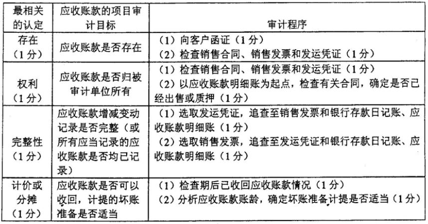 审计目标对审计工作发挥着导向作用,注册会计师通常依据各类交易、账户余额和列报的相关认定确定审计目标,根据审计目标设计审计程序。下表是有关应收账款的认定、审计目标和审计程序。