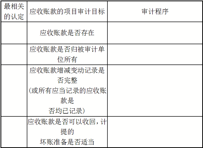 【要求】根据应收账款项目审计目标的提示,填写相应的最相关认定,并针对每个审计目标设计两项简要的审计程序(填入表中)。