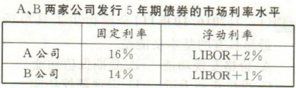 答:假定A、B两个公司都想通过发行债券的方式借入5年期的,价值100万美元的货币借款,但A公司为与其资产相匹配,想以固定利率方式借入资金,而B公司想以浮动利率借入资金。两家公司信用等级不同,A公司信用等级低于B公司,故市场向它们提供的利率也不同,如下表所示。