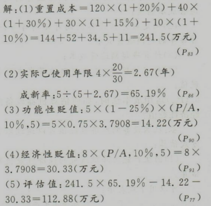 某塑料制品生产线建于2006年1月,月生产能力30吨,总投资200万元,其中主机120万元,建筑安装工程费用40万元,其他设备费用30万元,其他各项费用10万元o2010年1月进行评估。当时主机价格上涨20%,建筑安装工程费上涨30%,其他设备价格上涨15%,其他费用水平上涨10%。由于市场原因,过去四年月产量平均为20吨,不过市场已好转,将来可以满负荷生产。该设备尚可使用5年。由于能耗高,污染重,与同类设备相比,每年需多耗能5万元,另需支付环境补偿费用8万元,且后者不可税前列支。企业所得税率25%,折现率10%。
