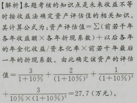 某资产预计前三年的纯收益分别为3万元、2万元、1万元,第四年开始每年为3万元,折现率与资本化率为10%,该资产的评估值约为 作者:高老师 时间:2024-07-29 浏览 2 某资产预计前三年的纯收益分别为3万元、2万元、1万元,第四年开始每年为3万元,折现率与资本化率为10%,该资产的评估值约为A、26.7万元B、27.0万元C、27.7万元D、30.0万元【正确答案】:C【题目解析】: 📱 扫码体验刷题小程序 扫一扫使用我们的微信小程序