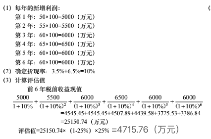 天龙电脑制造公司拟于2018年12月31日购买甲公司的著名电脑商标使用权。使用期限为6年,双方约定,由天龙公司每年按使用该商标后的新增利润的25%支付给甲公司作为商标使用费。天龙公司使用该商标后,每台电脑的价格可加价100元。据评估人员预测:第一年销售量为50万台,第二年为55万台,第三年为60万台,第四年为65万台,第五年为60万台,第六年销售量维持在60万台。假设社会无风险报酬率为3.5%,该专利的风险报酬率为6.5%,企业所得税税率为25%