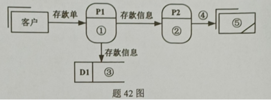 某银行储蓄系统存款的工作流程如下:客户提交存款单,系统进行存款业务处理,并保存存款信息,最后打印存款单,将存款单返回给客户。上述工作对应的数据流程图如题42图所示,请按照图中标号填写恰当内容,以完善该数据流程图。